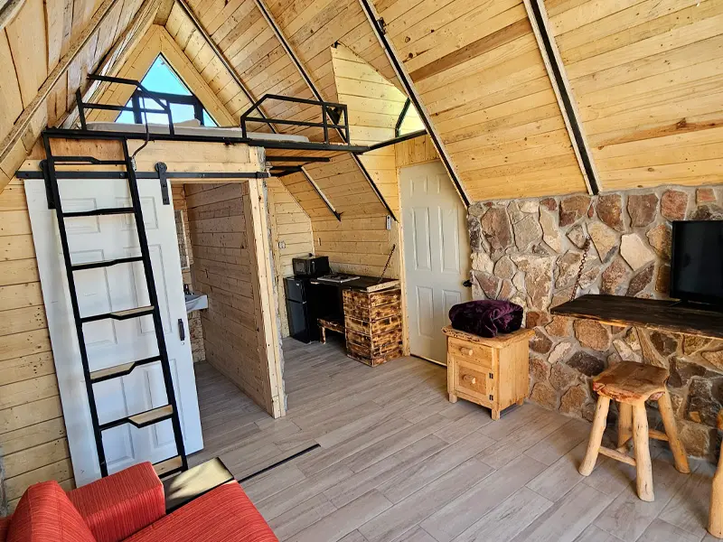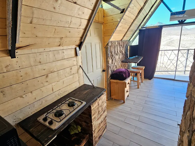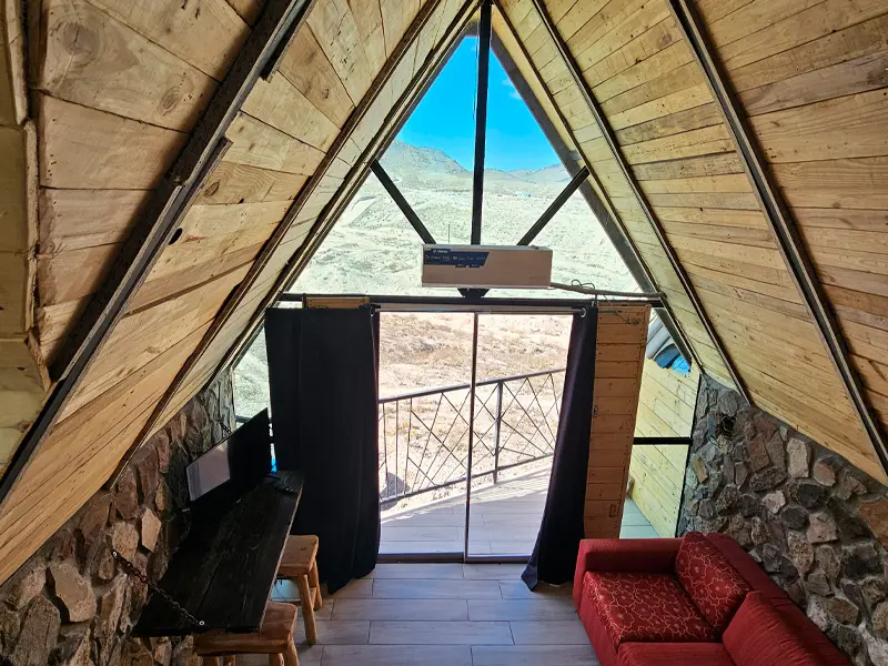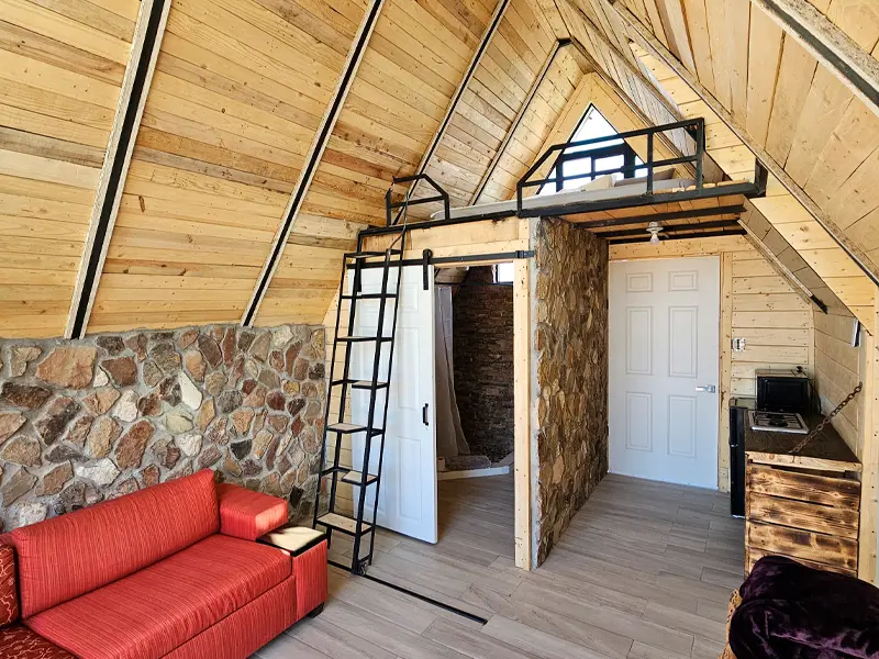 La Cabaña Sencilla 4 es una joya arquitectónica que combina piedra, madera y un diseño moderno, creando un espacio con un aspecto único y diferente. Diseñada para 2 a 4 personas, esta cabaña ofrece una experiencia exclusiva con su terraza flotante y balcón privado, ambos con vistas espectaculares a la Sierra de Ciudad Juárez.